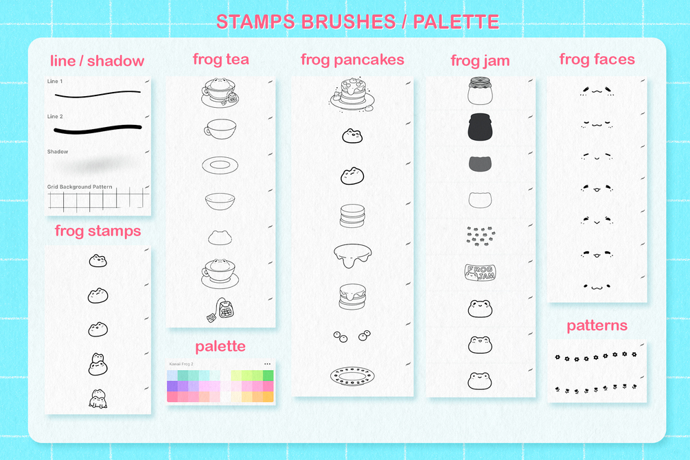 stamps of 3 types of desserts with frogs; outline and shadow brushes; grid background stamp; color palette